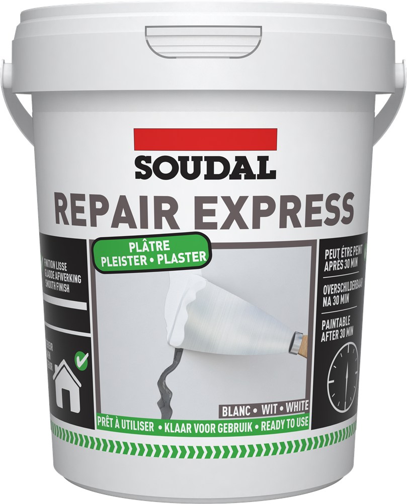 Repair Express Plâtre est un enduit prês à l'emploi pour reboucher et réparer les trous et fissures dans des murs et des plafonds, en intérieur. Il est sans retrait, et peut se poncer, peut se peindre immédiatement.