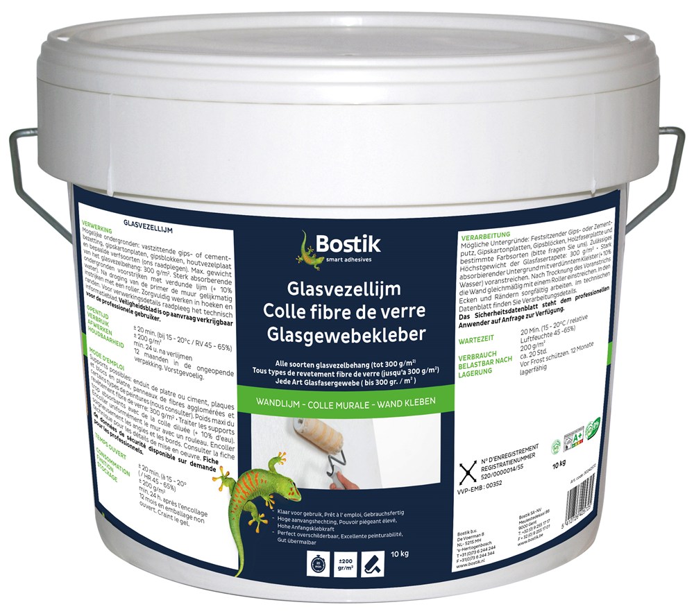 Gebruiksklare vinyllijm voor het verlijmen van glasvezelbehang. Voor normaal poreuze wanden en plafonds.